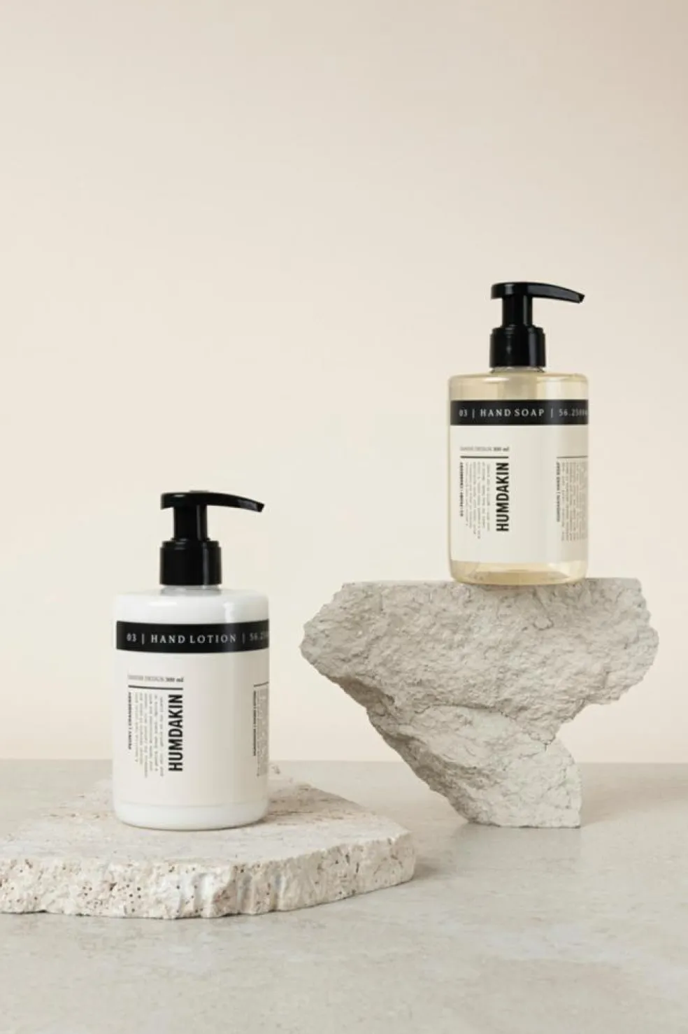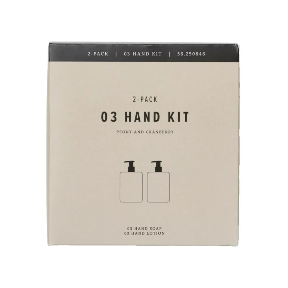 Nu kan du købe håndsæbe og lotion som et smukt gavesæt i vores milde 03 duft med plejende ekstrakter af pæon og tranebær.