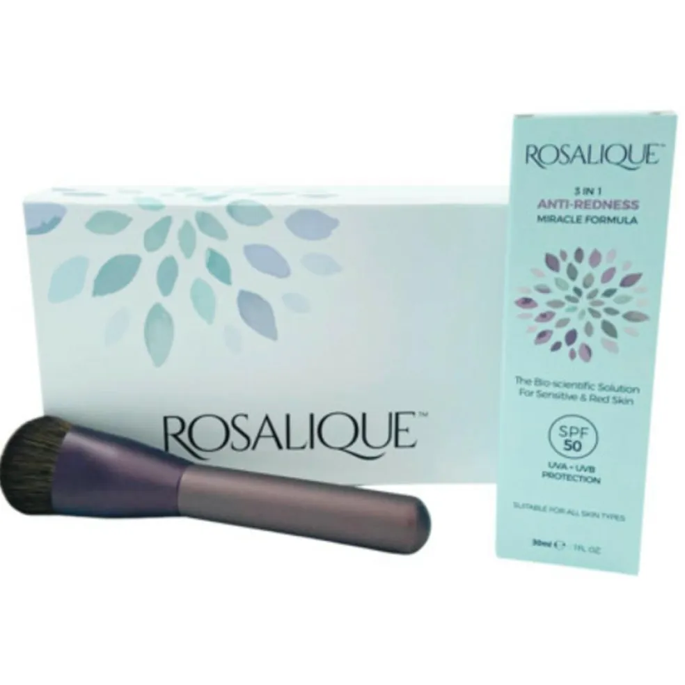 Når børsten bruges sammen med Rosalique 3-i-1 anti-rødme creme, oplever man den fantastiske effekt, af de tætte børstehår, som nænsomt ”buffer” produktet rundt på huden, og giver en flot ensartet dækkeevne.