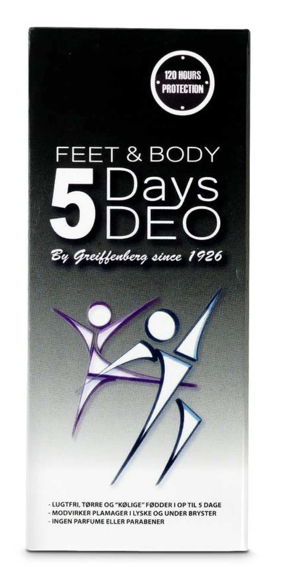 5Days Spray er en langtidsvirkende deodorant, der kun skal anvendes hver femte dag og derfor er skånsom mod huden. Egenskaber: – Lugtfri, tørre og “kølige” fødder i op til 5 dage – Modvirker plamager under brystet og i lysken – Modvirker svedige hænder – Reducerer risikoen for vabler – Kan også bruges som almindelig deodorant – Pengene tilbage garanti – Uden parfume. – Kan anvendes af gravide. – Der ydes pengene-tilbage-garanti. – Én flaske svarer til 5 måneders forbrug.