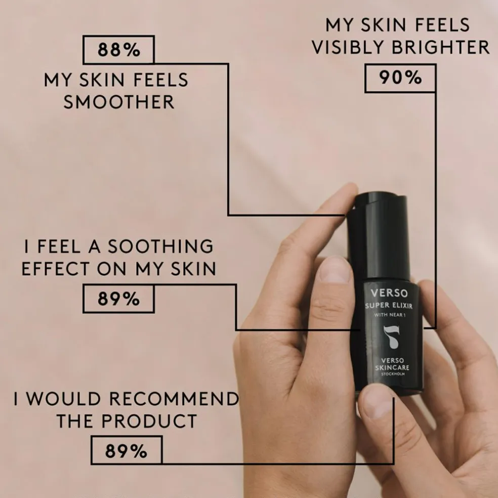 Verso Super Elixir er det første produkt nogensinde med NEAR-1 – et nyt, unikt molekyle udviklet og patenteret af Verso Skincare, som modvirker en trist/mat hudtone og synligt ensarter og forbedrer hudens struktur.