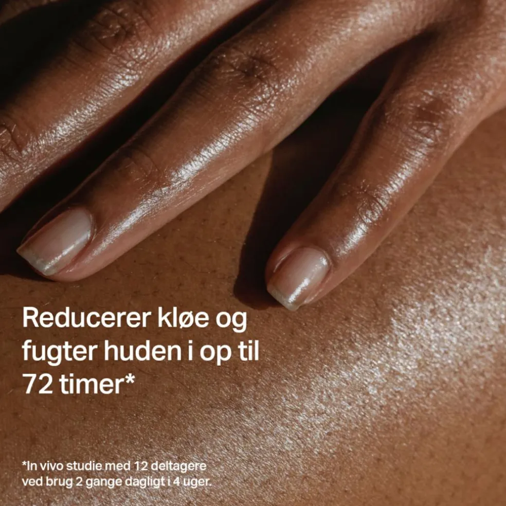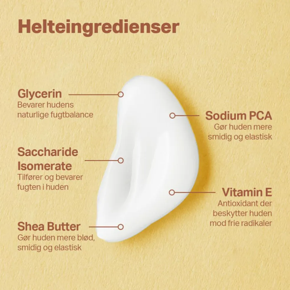 - Den er rig på ingredienser som aloe-vera, sheasmør og allantoin, som virker beroligende, kløestillende og gør huden blød og smidig