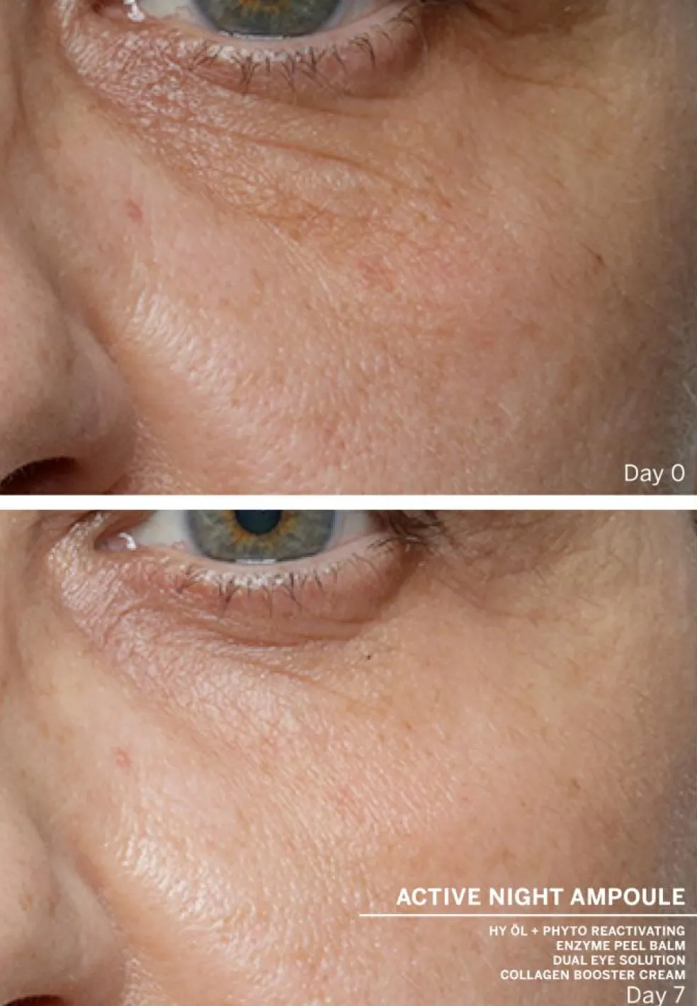 Kombinationen af aktive ingredienser i Active Night-ampullen hjælper med at forynge, vedligeholde og styrke hudens barriere samt reducere synligheden af rynker natten over. Huden efterlades intenst fugtet og mere modstandsdygtig over for miljøpåvirkninger. Resultatet er en afslappet og forynget morgenhud.