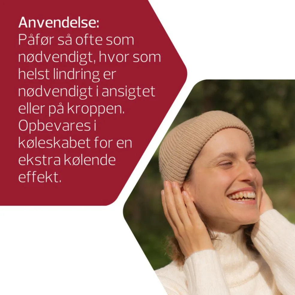 - Bruges til at lindre og fugte irriteret og kløende hud både i ansigtet og på kroppen.