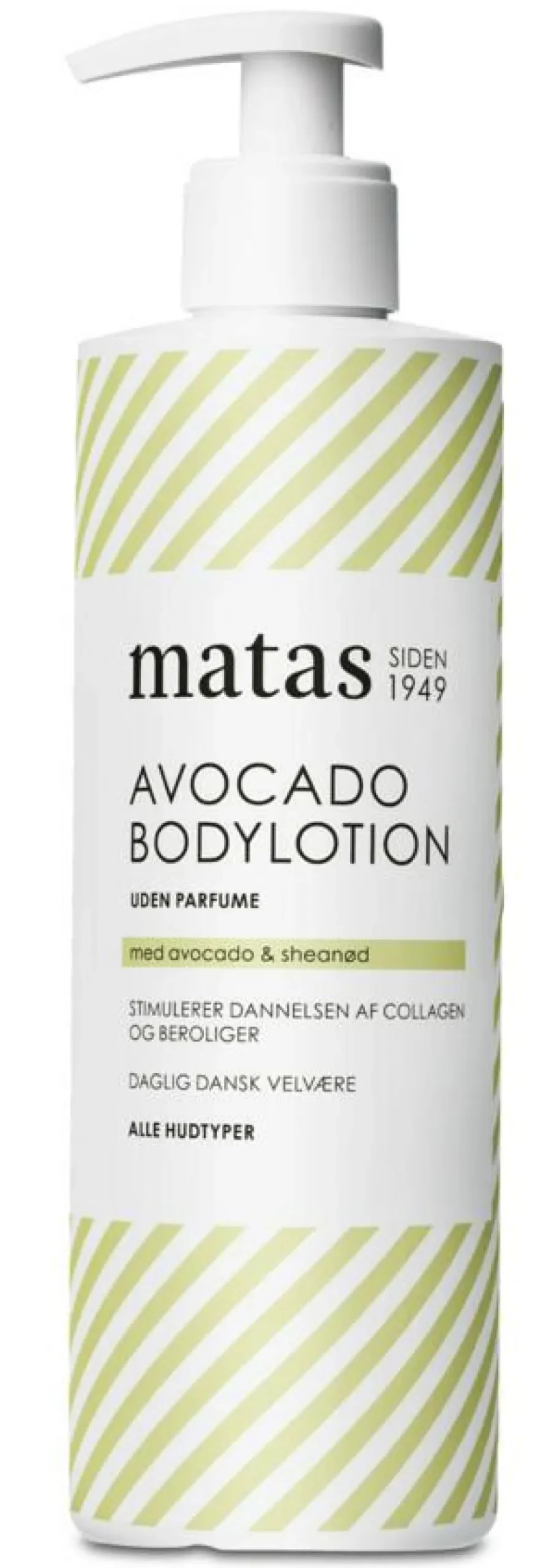Lotionen giver masser af fugt til hele kroppen på grund af det tilsatte glycerin og trænger hurtigt ind i huden, som efterlades dejligt blød og velplejet. Matas Avocado Bodylotion er også rig på avocadoolie, der stimulerer hudens dannelse af collagen. Sheanød virker beroligende på huden.