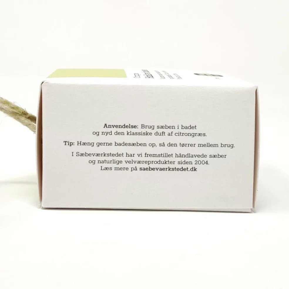 Sæben er fremstillet af økologisk oliven- og kokosolie og den dufter friskt og aromatisk af æterisk olie af Citrongræs. Sæben hænger på en hampsnor, så den holder sig tør og varer længe