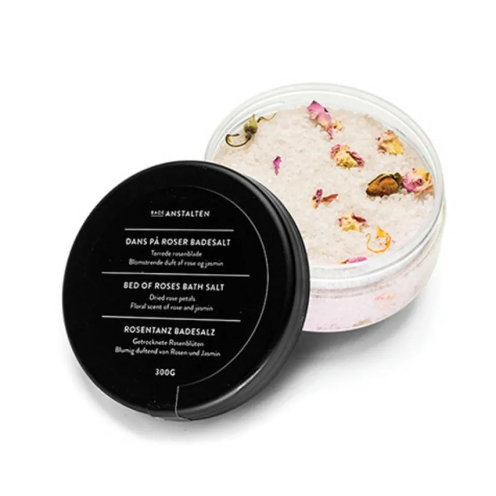 Forkæl sanserne og kroppen med et velduftende rosenbad med roser, havsalt, mandelolie og afslappende æteriske olier i form af palmarosa, citron og sandeltræ.