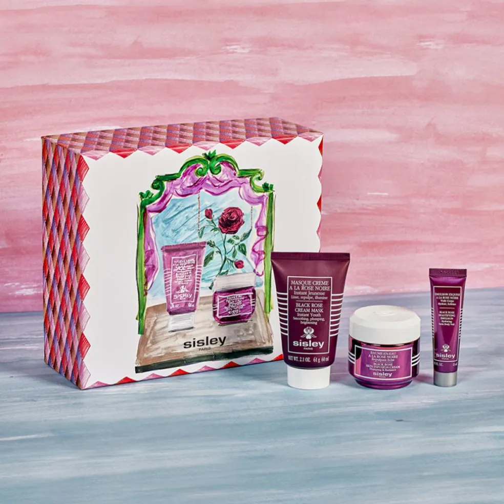 Gaveæsken afspejler skønheden i en af Sisleys ikoniske hudplejekollektioner med en farvestrålende teaterscene og en storslået rose.
