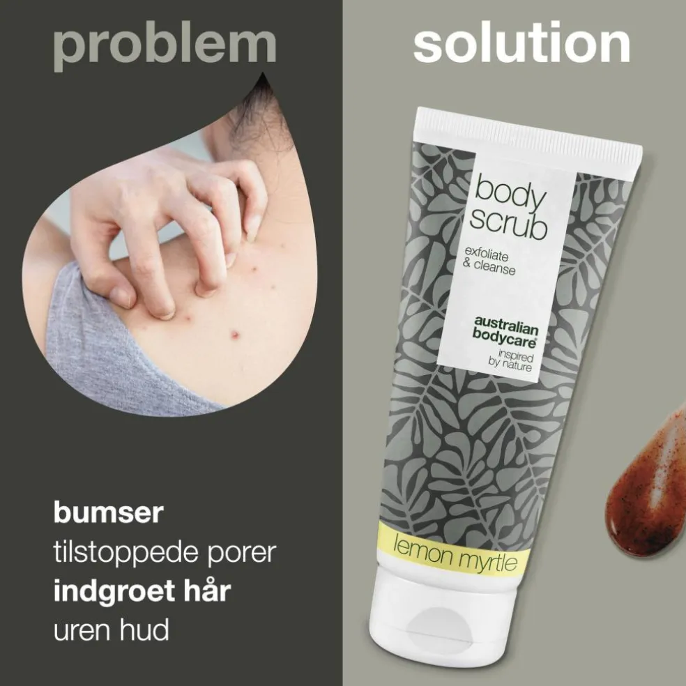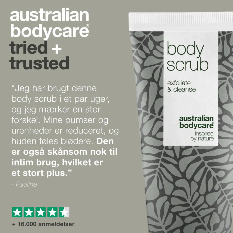 Scrub bruges 1-2 gange om ugen i forbindelse med bad. Efter vask af huden på kroppen påføres Body Scrub den våde hud i cirkulære bevægelser. Vær særlig grundig med at massere produktet godt ind, hvor der er bumser, hudorme og uren hud, fx på ryggen og ballerne. Skyl herefter overskydende produkt og skrubbekorn af huden. Efter dit bad og når du har duppet dig tør, er det vigtigt, at du smører dig med en god creme for at tilføre fugt til huden. Vi anbefaler Australian Bodycare Body Lotion. Inden brugen af scrub kan du med fordel vaske huden ren med Body Wash fra Australian Bodycare.