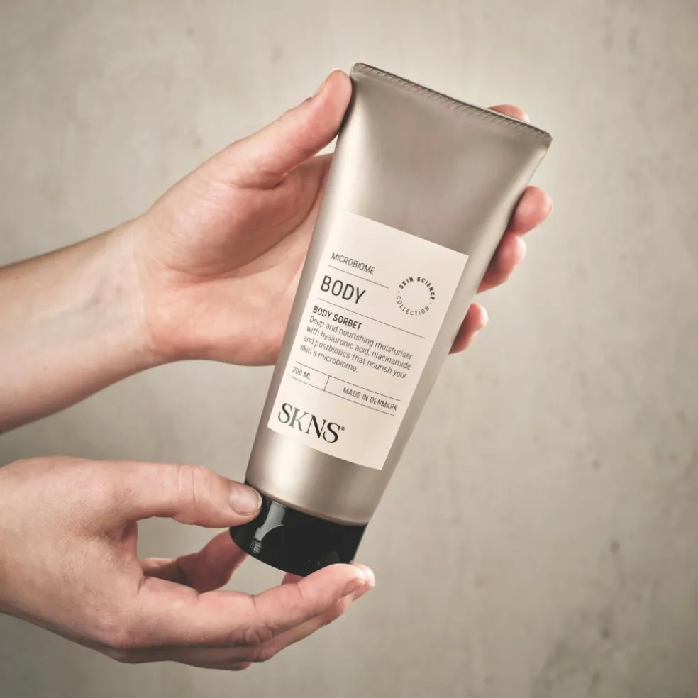 Dybdevirkende og nærende body sorbet med hyaluronsyre, niacinamid og postbiotika, der nærer din huds mikrobiom.