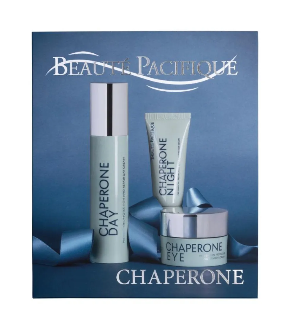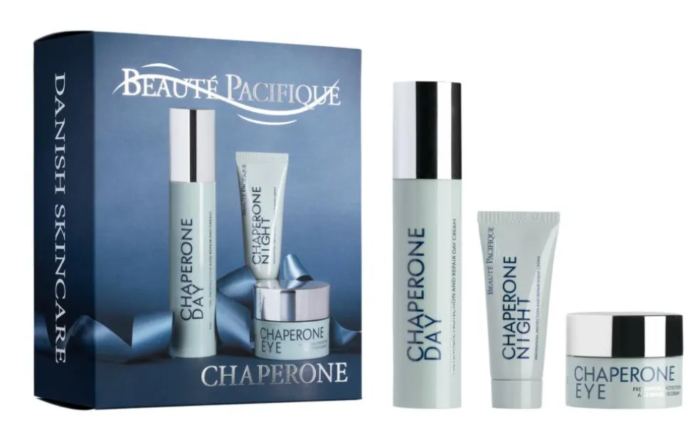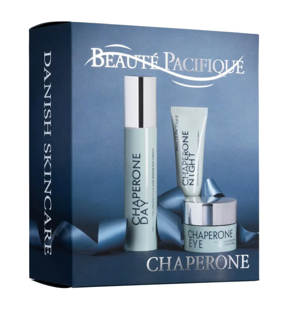 Smuk gaveæske med Chaperone produkterne, som er en helt ny generation af anti-age hudpleje. Produkterne er baseret på nye aktiver, som bremser og vender hudens aldringsprocesser, så den genvinder tabt styrke og udstråling – altså gør Chaperone huden stærk og robust igen.