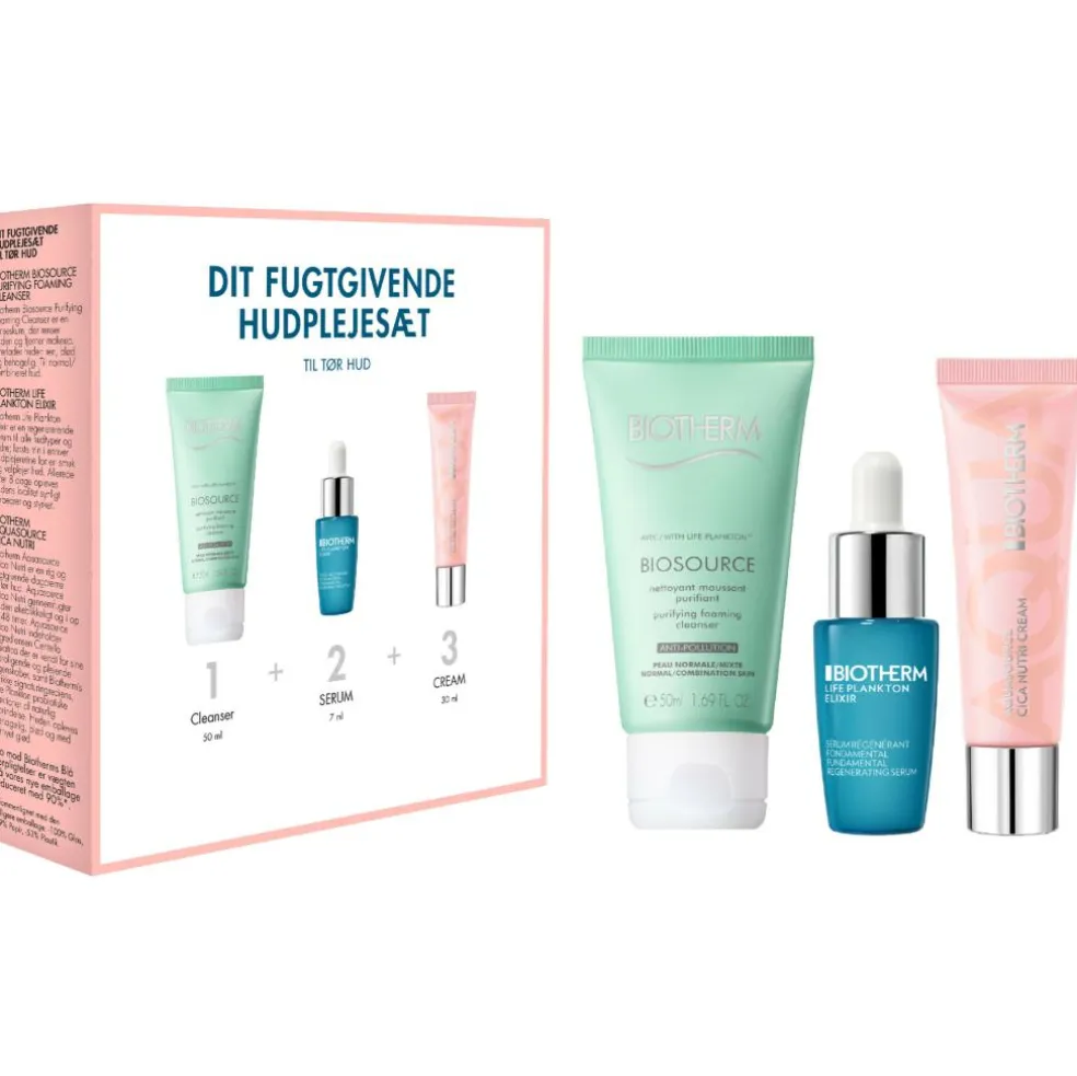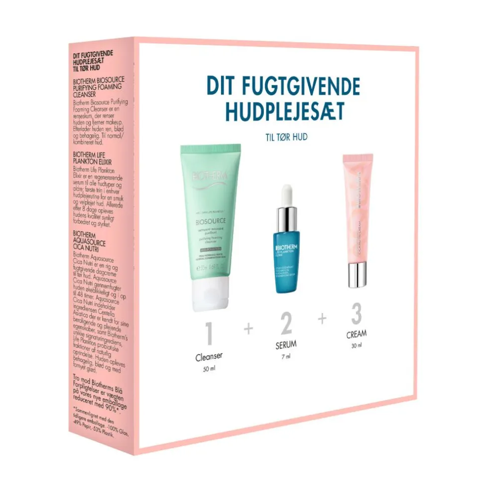 For at opnå den bedste effekt med dit Biotherm-sæt, følg disse enkle trin morgen og aften: Start med at fugte ansigtet med lunkent vand, skum derefter Biosource Purifying Foaming Cleanser op i hænderne og massér den ind i huden for at rense og fjerne makeup; skyl grundigt og dup huden tør.