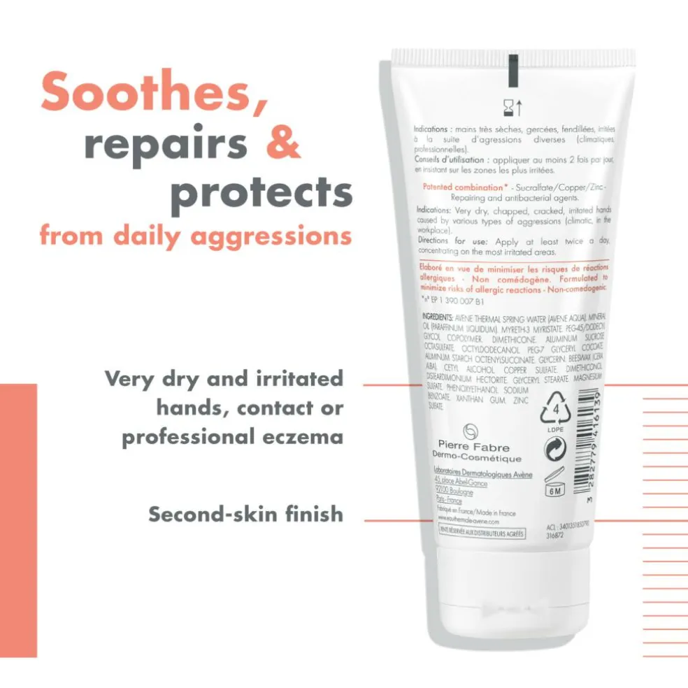 Avène Cicalfate Repairing Hand Cream er en beroligende og genopbyggende barrierecreme, der er udviklet til meget tørre, sprukne og irriterede hænder. Den lægger en vandafvisende beskyttelse på huden og hjælper med at genoprette hudbarrieren og berolige ubehag som svie, stramhed og rødme uden at fedte eller klistre.