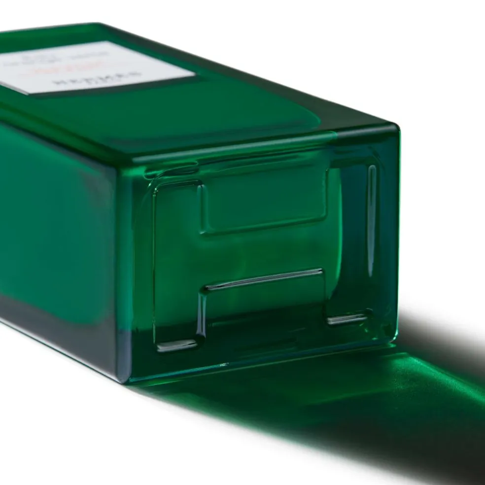 Flaskens retlinede silhuet prydes af en dyb grøn farve, som er ikonisk for Eau d’orange verte, og af to signaturdetaljer: