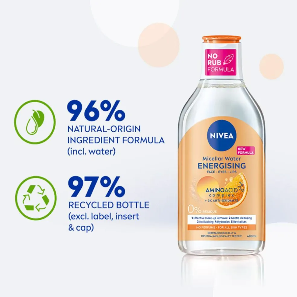 Passer til alle hudtyper, NIVEA Energizing Micellar Water fjerner makeup, renser, fugter og revitaliserer huden uden at efterlade nogen rester. Den opkvikkende formel med Amino Acid Complex og 3X antioxidanter, der indeholder C-vitamin, B3-vitamin og tranebærekstrakt, er beriget med rensende miceller og milde aminosyrer. Den fjerner effektivt din makeup, urenheder og snavs med blot nogle lette strøg, uden at du behøver at gnide. Vores Micellar Water er parfumefri og testet dermatologisk og oftalmologisk. Med mere end 130 års erfaring er NIVEA markedsleder inden for global hudpleje. Vores forskere arbejder omhyggeligt for at levere hudplejeprodukter af høj kvalitet, der er testet dermatologisk, og som passer til dine hudbehov. Hos NIVEA bekymrer vi os lige så meget om planeten som om din hud, ved at bruge genanvendt plastik og skabe biologisk nedbrydelige formler: NIVEA Energizing Micellar Water til alle hudtyper.