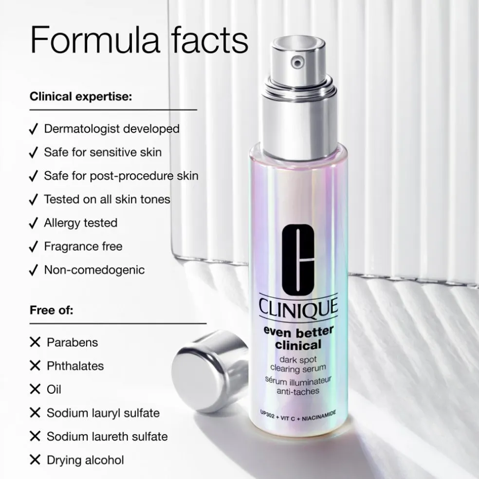 Serummet bekæmper svære mørke pletter og reducerer synligt genstridige pletter, herunder solpletter, alderspletter og mærker efter urenheder. Det hjælper med at forebygge mod fremtidige mørke pletter, mens det beroliger huden. Huden vil fremstå lysere og mere strålende med en jævn hudtone.