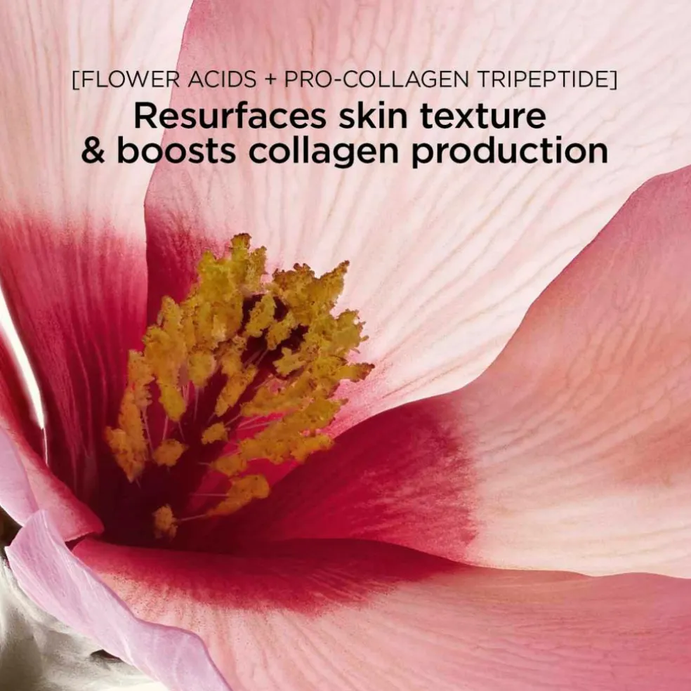 Dag for dag udglattes linjer, huden bliver fastere og ser mere tonet ud. Syrer fra hibiscus sabdariffa-blomsten fremmer hudens eksfoliering takket være deres naturlige indhold af AHA og pyrovinsyre.