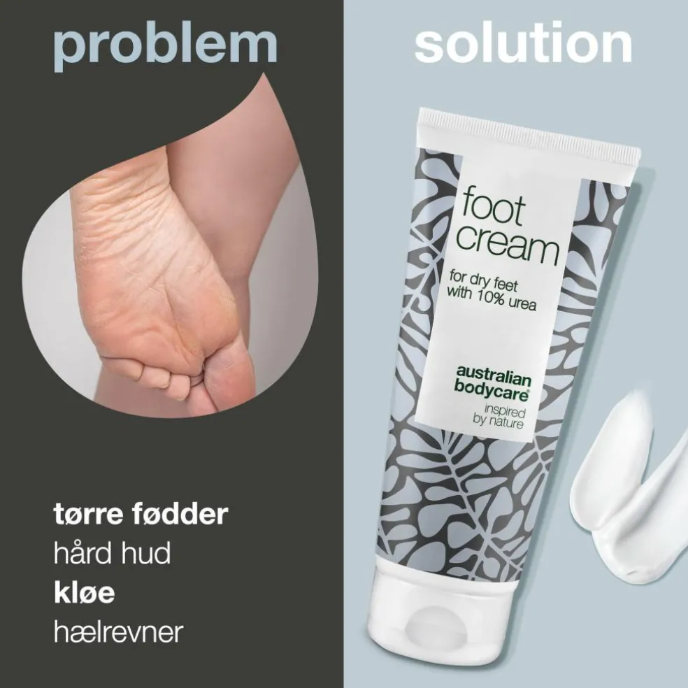 Den nærende og plejende fodcreme indeholder Tea Tree Oil, der sikrer, at bakterier og snavs ikke trænger ned i den tørre hud, som er ekstra udsat. Sheasmør og Urea (10% indhold) opløser og plejer den hårde og tørre hud.