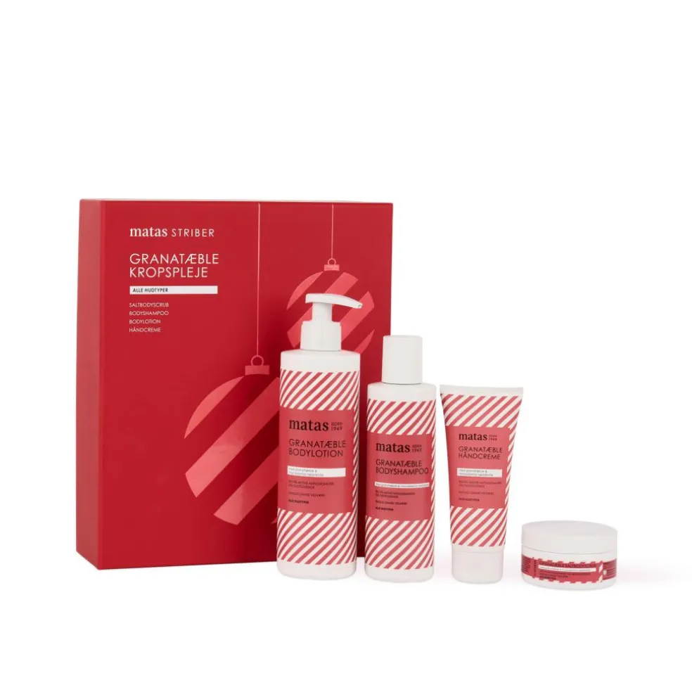 Matas Striber Granatæble Kropspleje Gaveæske er den perfekte gave til dig selv eller en du holder af i julen. Denne skønne gaveæske indeholder fire luksuriøse produkter, der plejer og forkæler din hud med en frisk granatæbleduft. Giv en gave, der spreder glæde og velvære i de kolde vintermåneder.