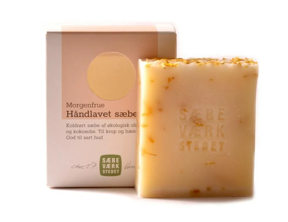 Mild, neutral sæbe til hele kroppen. Sæben er fremstillet af rene planteolier, med en overvægt af økologisk olivenolie. Sæben indeholder desuden olie og kronblade af Morgenfrue.