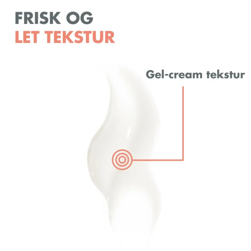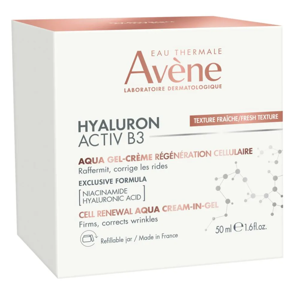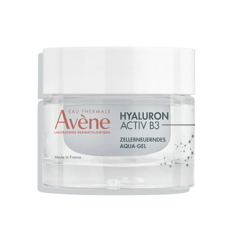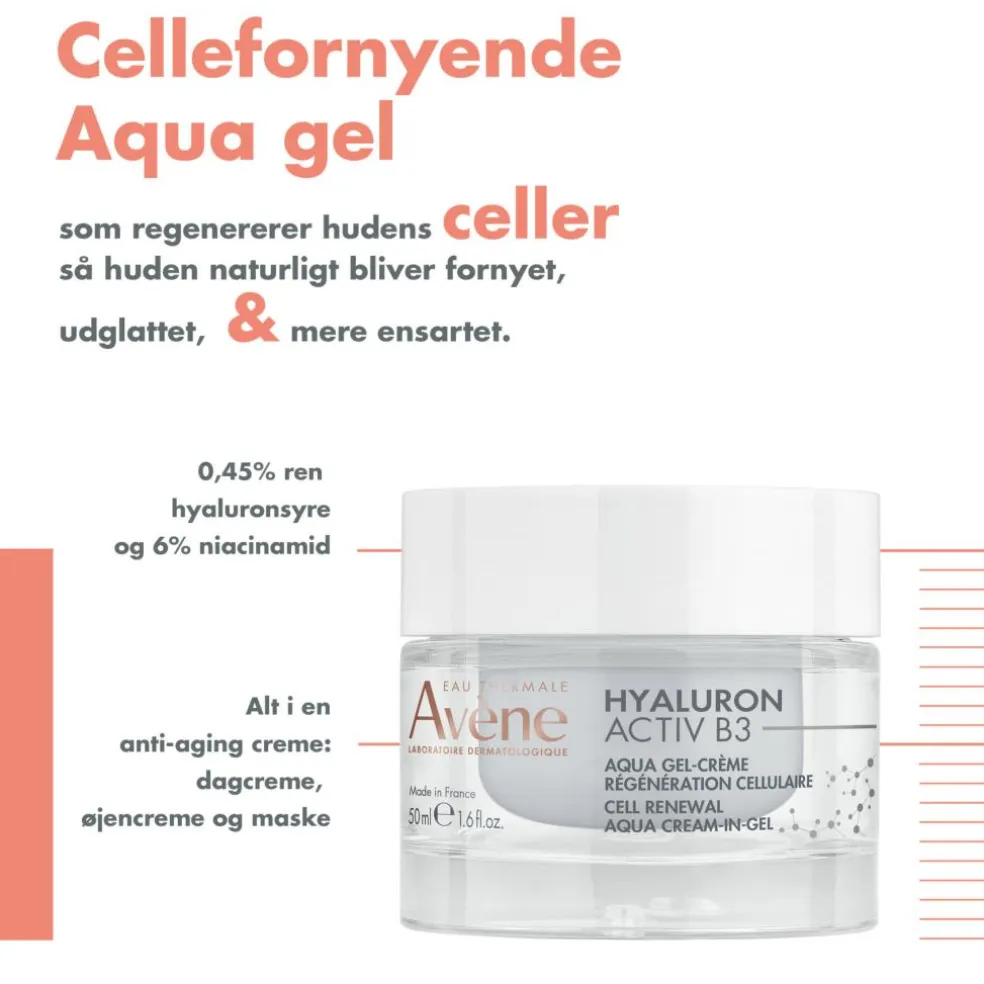 Hyaluron Activ B3 Aqua Gel indeholder 6% niacinamid og hyaluronsyre i to størrelser: store molekyler som fugtgiver huden og små molekyler som fremmer hudens egen produktion af hyaluronsyre.