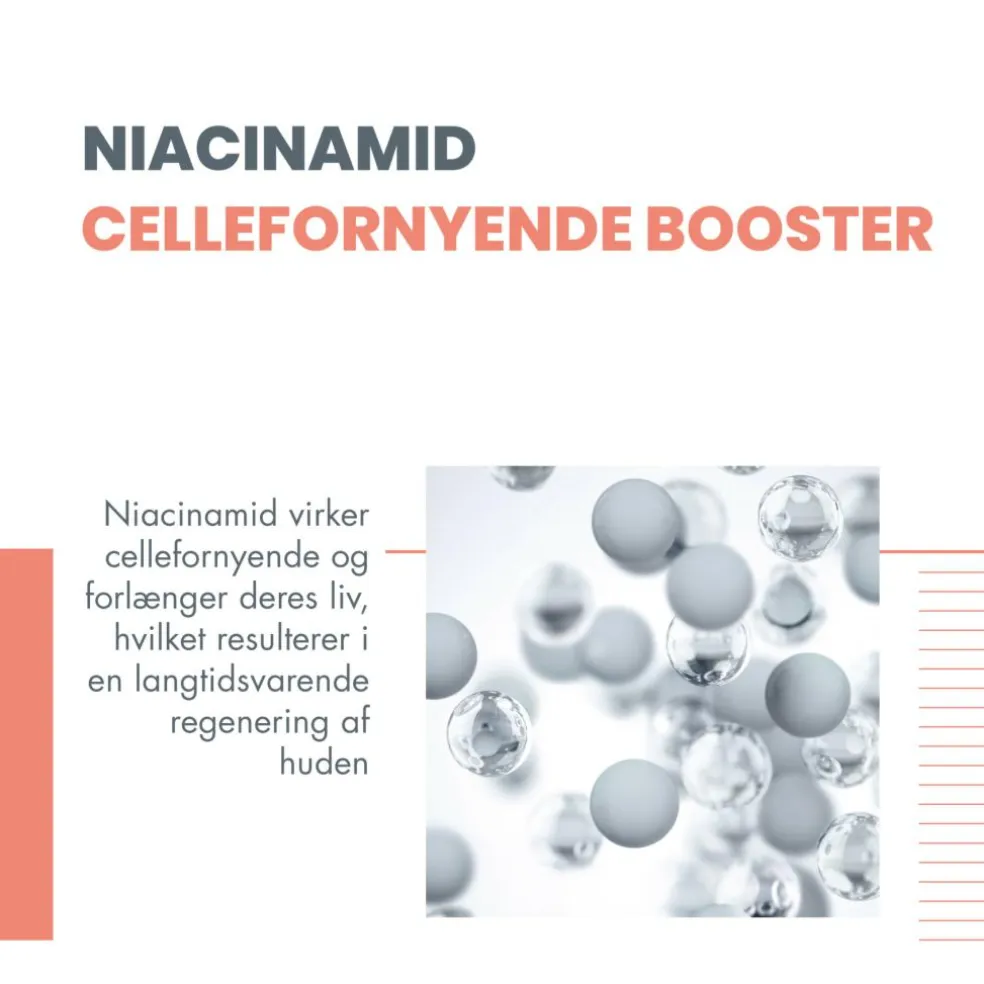 NIACINAMID: Styrker hudbarrieren, forlænger cellernes levetid og reducerer rynker og linjer