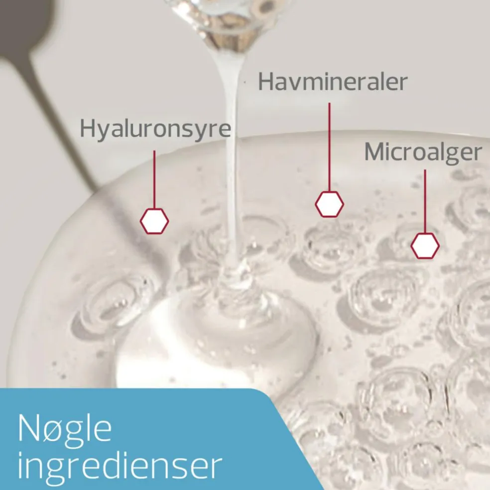 Denne ansigtsserum til daglig brug, der er formuleret med tredobbelt fugtkompleks, hyalonsyre, havvand og mikroalger, fugter i dybden, lindrer og nærer huden.