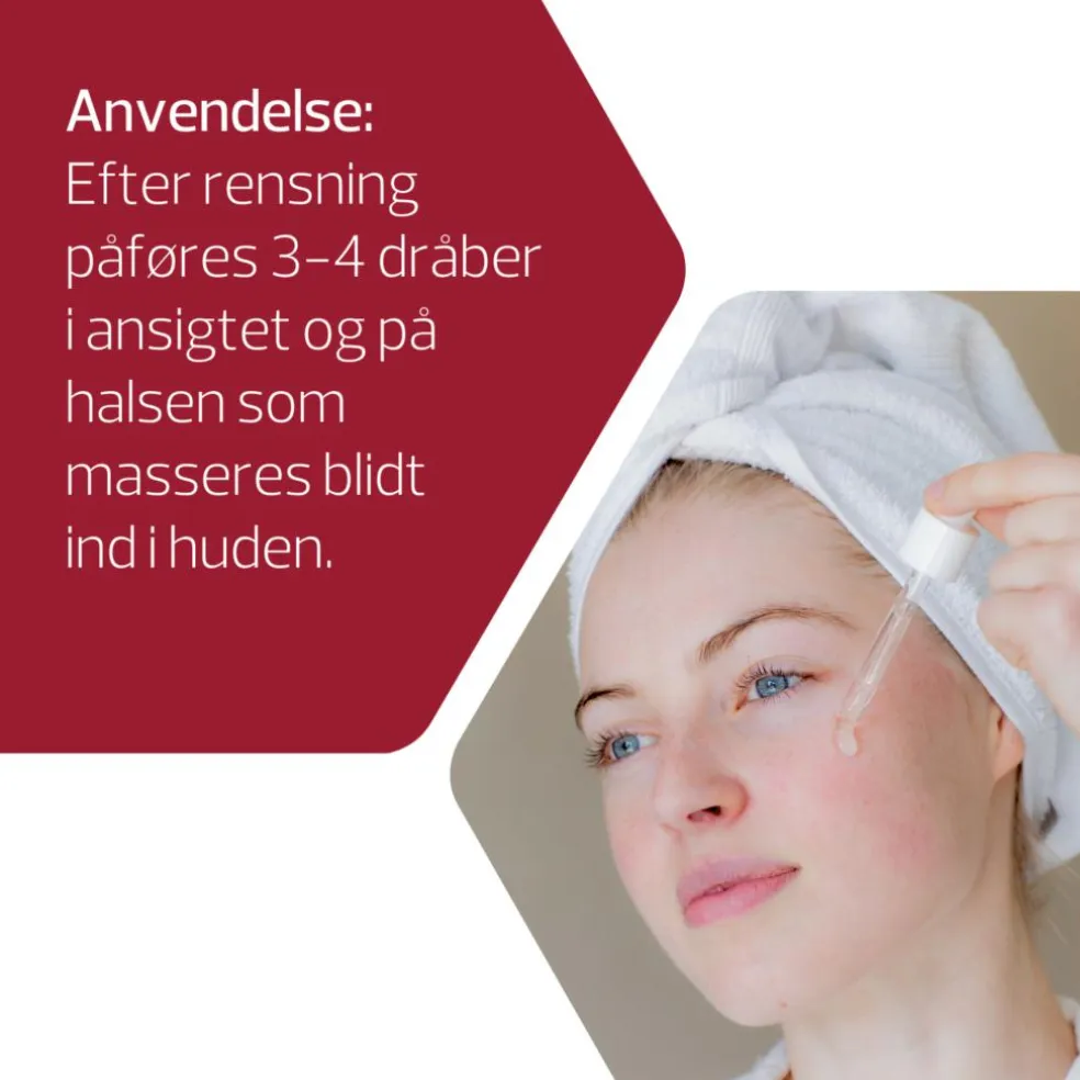 - Massér nænsomt 3-4 dråber ind i ansigtet og på halsen.