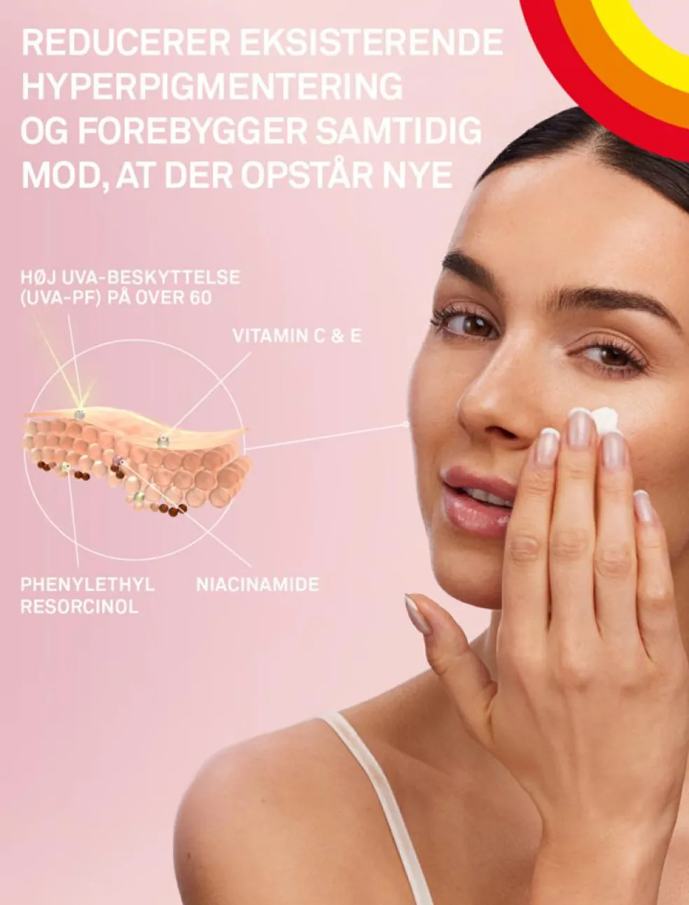 Solcremen indeholder en unik høj UVA-beskyttelse, der er med til at forhindre forekomsten af hyperpigmentering i huden. Herudover indeholder solcremen Vitamin C og E og Phenylethyl Resorcinol, der er med til at minimere produktionen af melanin i huden. Niacinamid hæmmer overførslen af melanin til de øverste lag af huden.