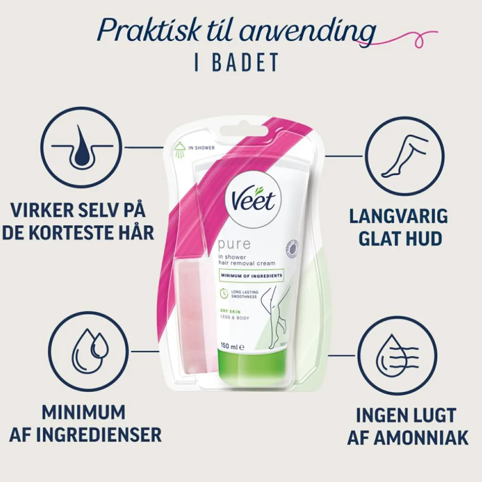 Veet Pure In Shower hårfjerningscreme er vores reneste formular, og indeholder ingen ubehagelig lugt af ammoniak.