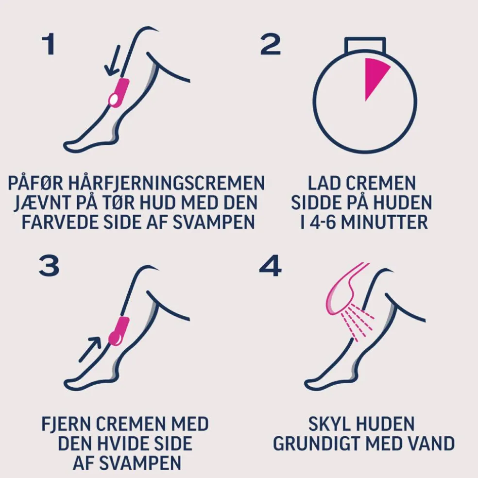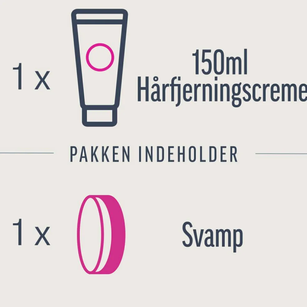 Pakken indeholder 150 ml hårfjerningscreme og en svamp til at påføre og fjerne overskydende creme.