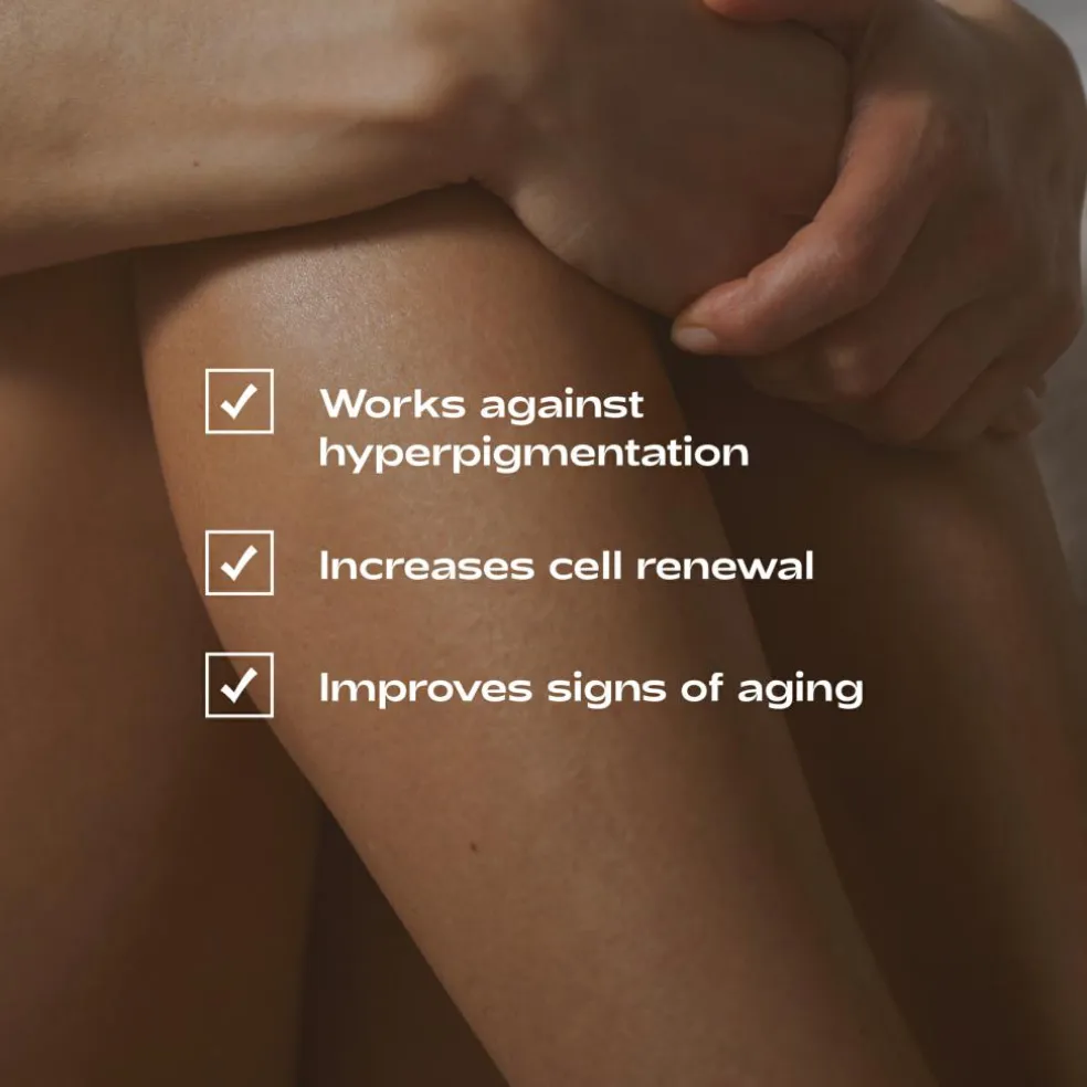 Desuden indeholder dette kropsserum flere naturlige AHA-syrer, der fremmer en glattere og yngre udseende hud ved at stimulere cellefornyelsen.