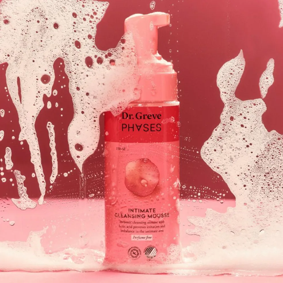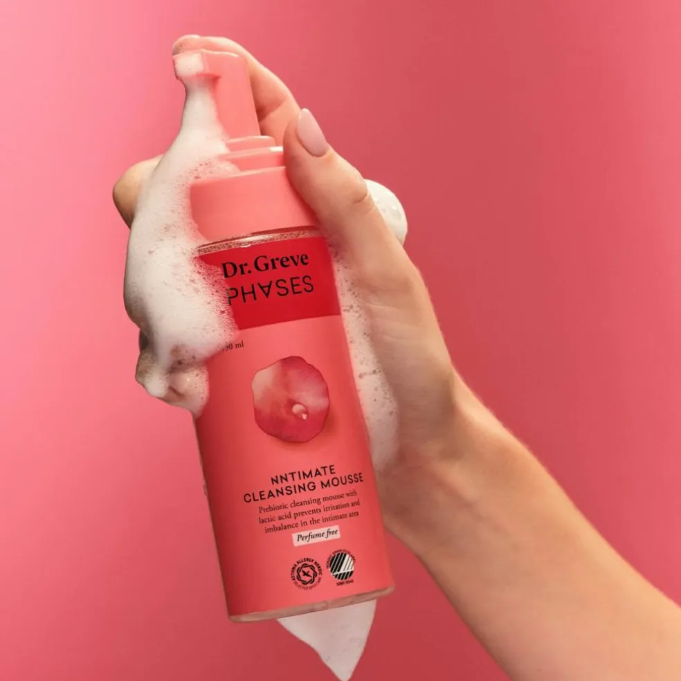 Dr. Greve Phases Cleansing Mousse er en parfumefri, præbiotisk intimvask med pumpe, der giver en cremet skumfornemmelse og hjælper med at forebygge irritation og ubalance i det intime område. • Parfumefri og pH-balanceret – hjælper med at forebygge irritation og ubalance i det intime område. • Indeholder det præbiotiske stof inulin. • Forstyrrer ikke pH-balancen i det intime område. • Svanemærket og anbefalet af Astma- og Allergiforbundet.