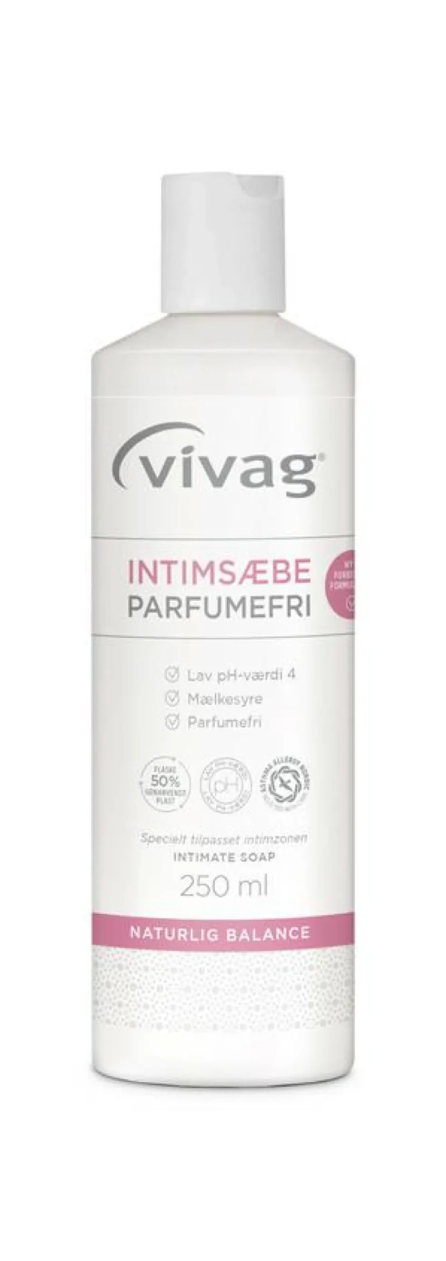 Vivag parfumefri intimsæbe har fået ny formulering, som giver sæben en fyldigere konsistens samtidig med at de velkendte egenskaber af Vivag intimsæbe bibeholdes.