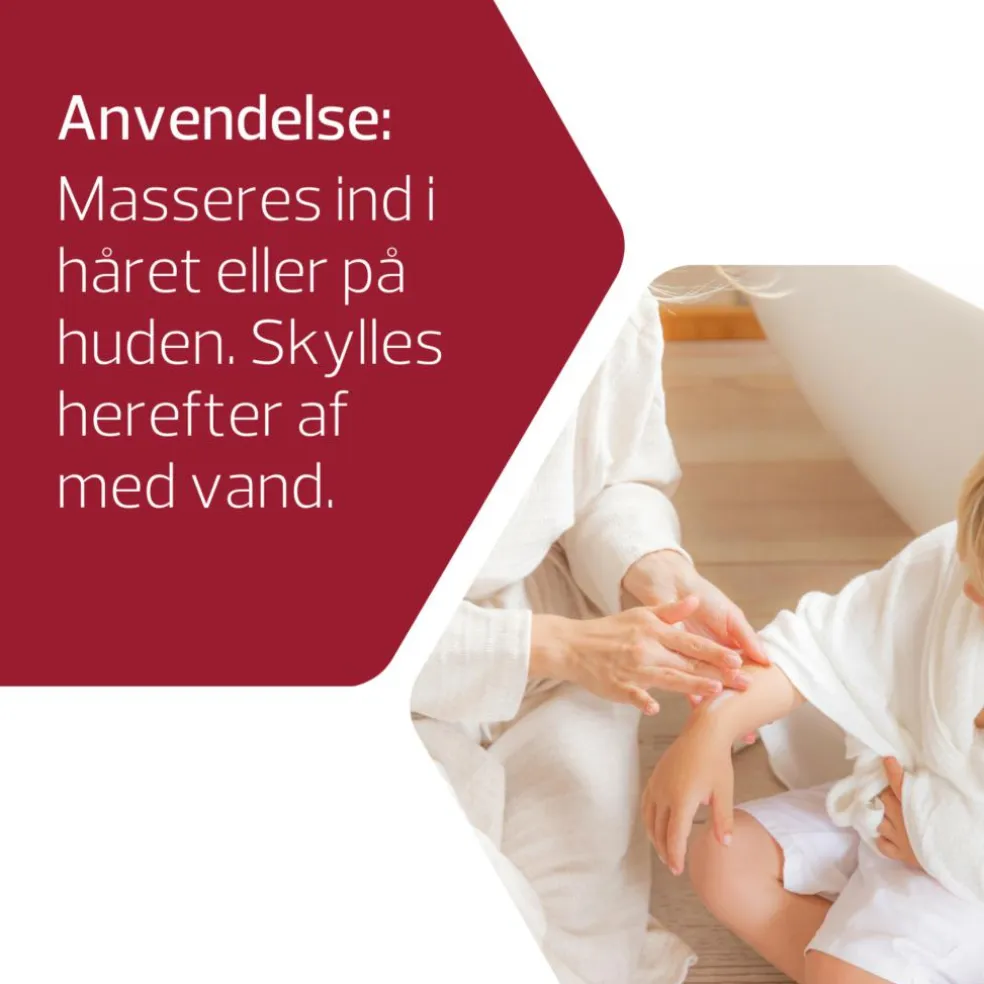 - Til håret: Påføres i fugtigt hår. Massér ind i hår og hovedbund, og skyl derefter af med vand
