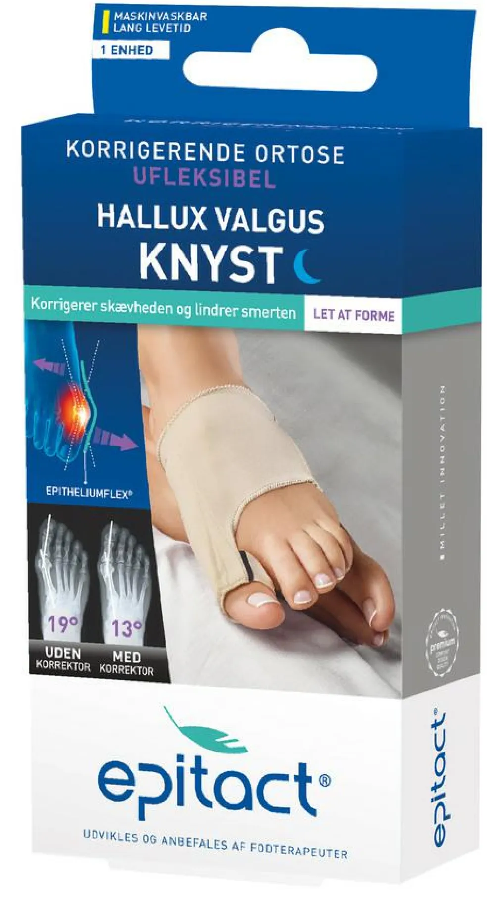 Hvad angår knyster, fjerner den naturligvis tryk og gnidninger, hvorved den lindrer kontaktbaserede smerter (lagen, madras osv.). Den termoformbare støtte korrigerer storetåens akse for at begrænse sammentrækning af ligamenterne i løbet af natten, som således lindrer natlige ledsmerter.