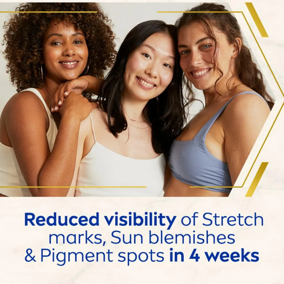 Den plejende formel med patenterede Luminous630® udjævner hudtoneforskellene for at reducere synligheden af strækmærker og pigmentpletter inden for 4 uger.