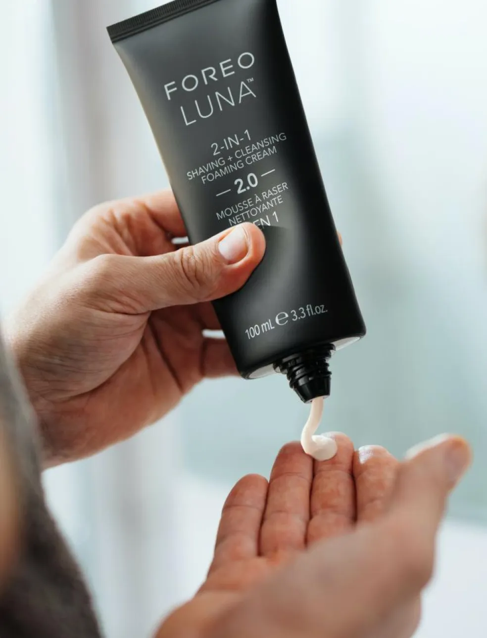 LUNA™ 2-i-1 Shaving + Cleansing Foaming Cream er en rensnings- og barberingsskum beriget med olivenolie, vitamin E, cica og purslane.