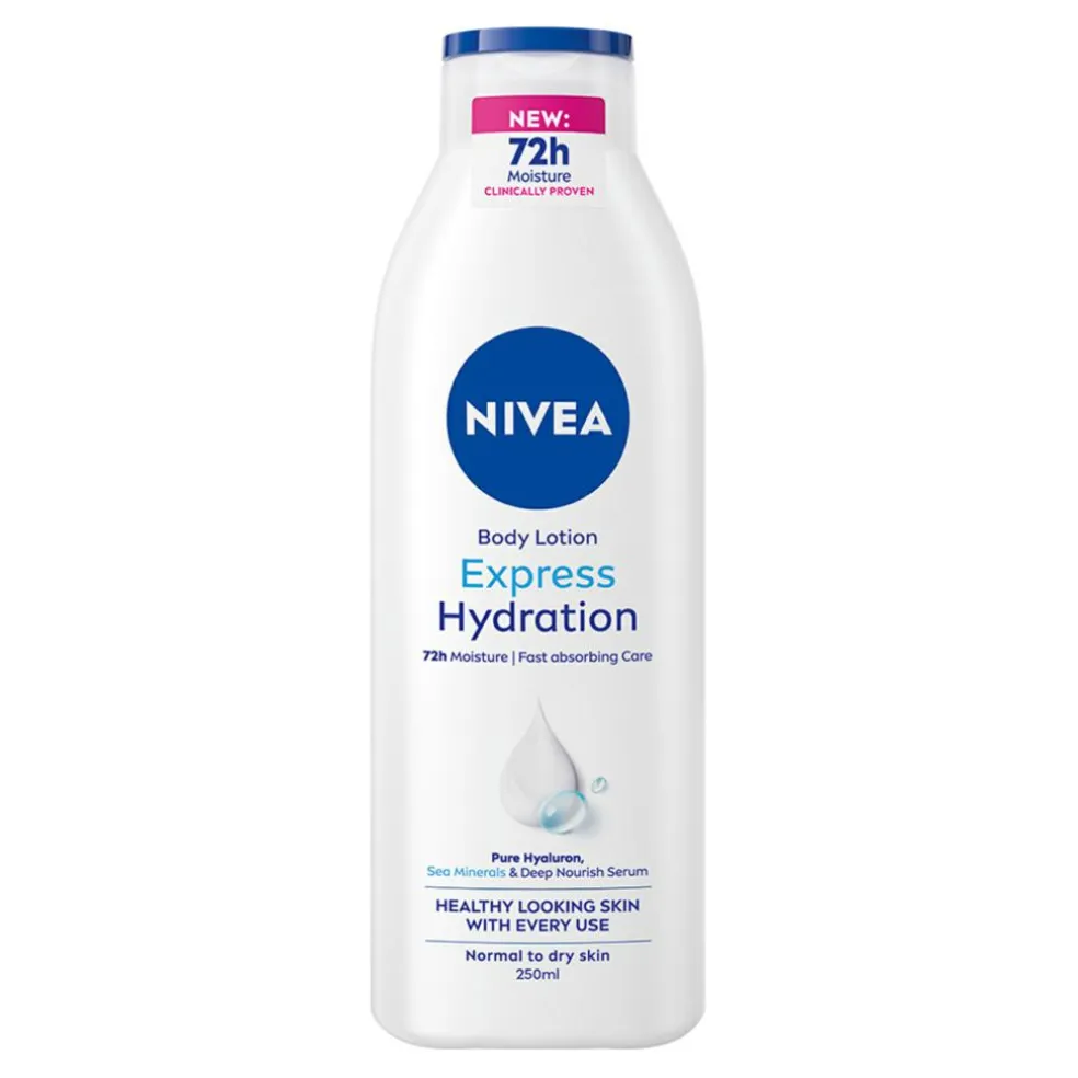 Forvandl din tørre hud med NIVEA® Express Hydration Body Lotion. Giver 5 i 1 komplet pleje: 1. 48 timers dyb fugt, 2. Blød hudfølelse, 3. Hurtigabsorberende, 4. Skønsom pleje og 5. Sund hud. Denne hudlotion beskytter huden, samtidig med at den giver hurtig absorberende fugt. Beriget med en kombination af plejende ingredienser, herunder NIVEAs Deep Moisture Serum. Nogle hudområder tørrer hurtigere ud end andre. Derfor er det vigtigt at give huden ekstra pleje året rundt, således din hud får alt, hvad den fortjener. Påfør denne NIVEA lotion dagligt over hele kroppen. Denne NIVEA hudpleje er dermatologisk testet. Velegnet til alle hudtyper, også dem med tør hud.