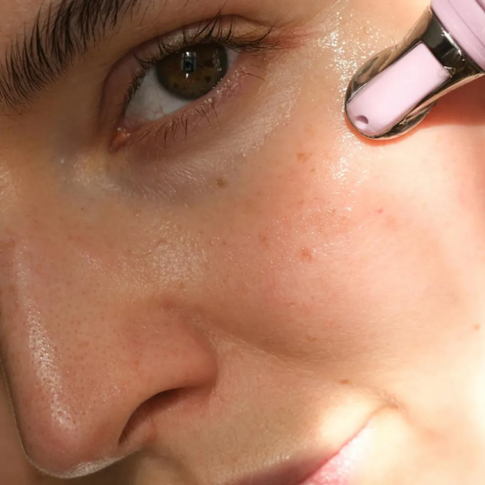 Kølende metalapplikator giver en forfriskende øjenkonturmassage.