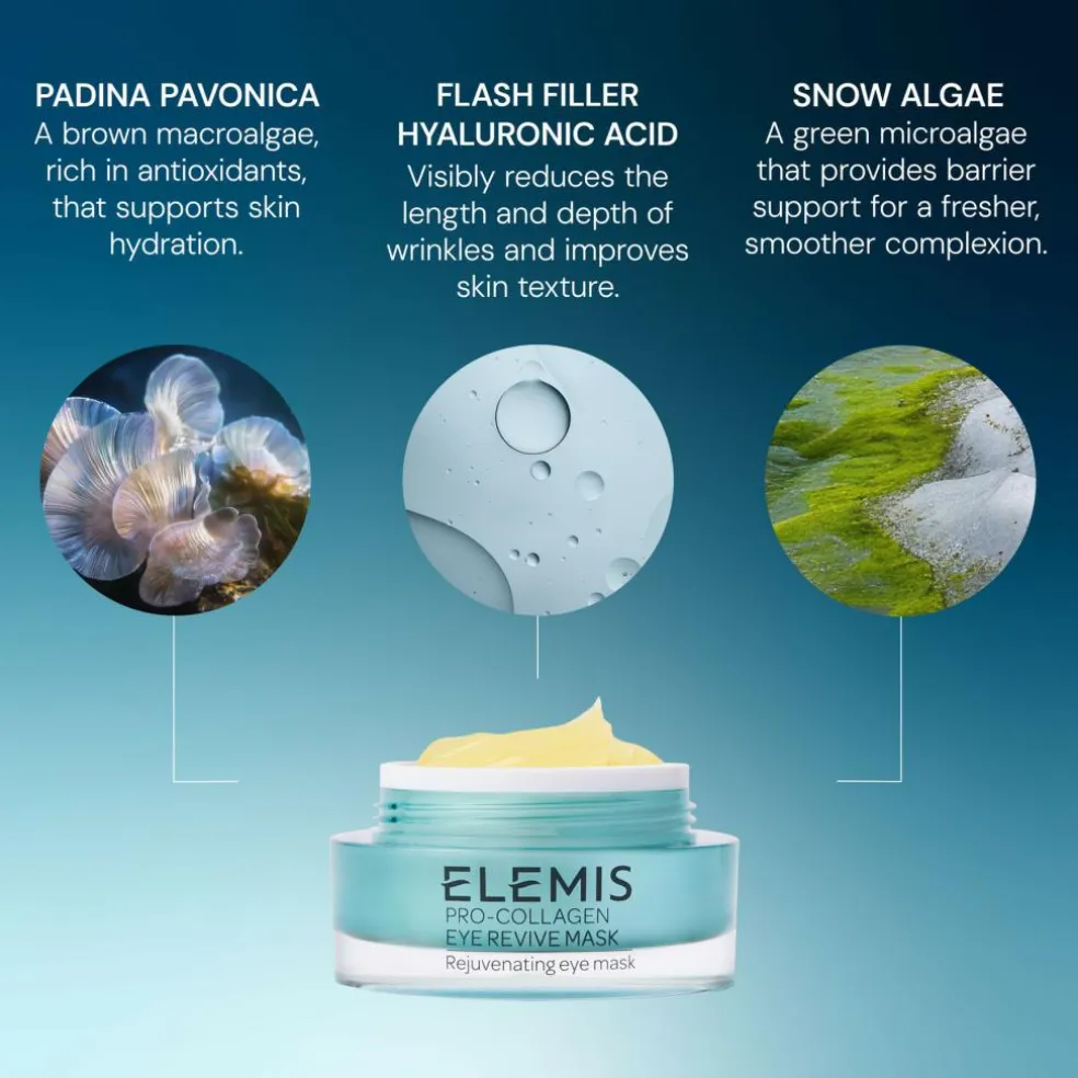 Denne fugtboostende øjenbehandling er formuleret med næste generations Flash Filler Hyaluronsyre, Vandmelon-snealge og vores heltealge Padina Pavonica, som dybt fugter og reducerer de synlige tegn på spændinger og træthed omkring øjenkonturen. Den lette, elastiske geltekstur føles kølende og forfriskende på huden og efterlader straks området omkring øjnene glattere og mere ungdommeligt. Den 3-i-1 formel kan bruges som en foryngende natmaske, en fugtgivende primer under øjnene og en plejende balm, der glatter og genopretter den sarte hud omkring øjnene.