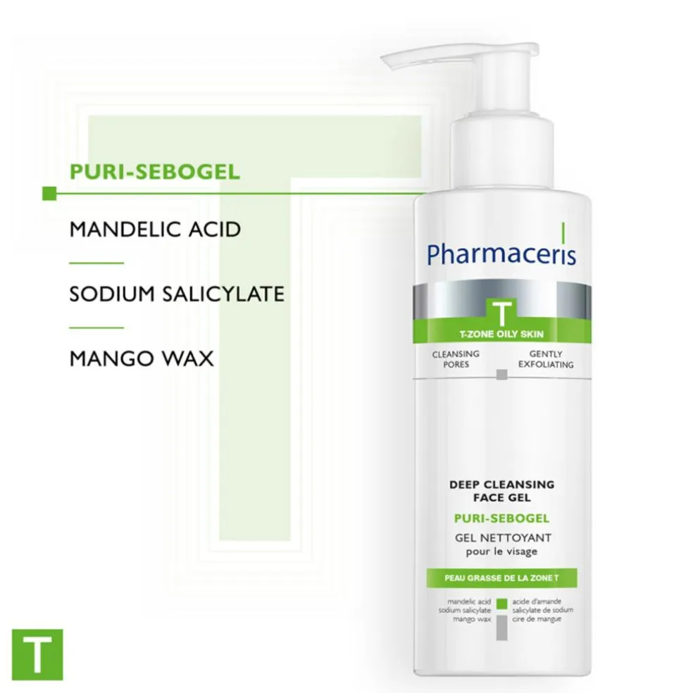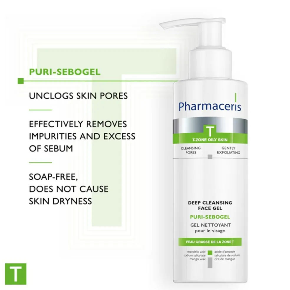 Påfør gelen på fugtig hud og rens dit ansigt ved hjælp af cirkulære bevægelser, undgå området omkring øjnene, og skyl efter med rent vand. Brug efterfølgende en passende ansigtstonic og creme fra Pharmaceris T serien. Bruges dagligt om morgenen og ved sengetid.