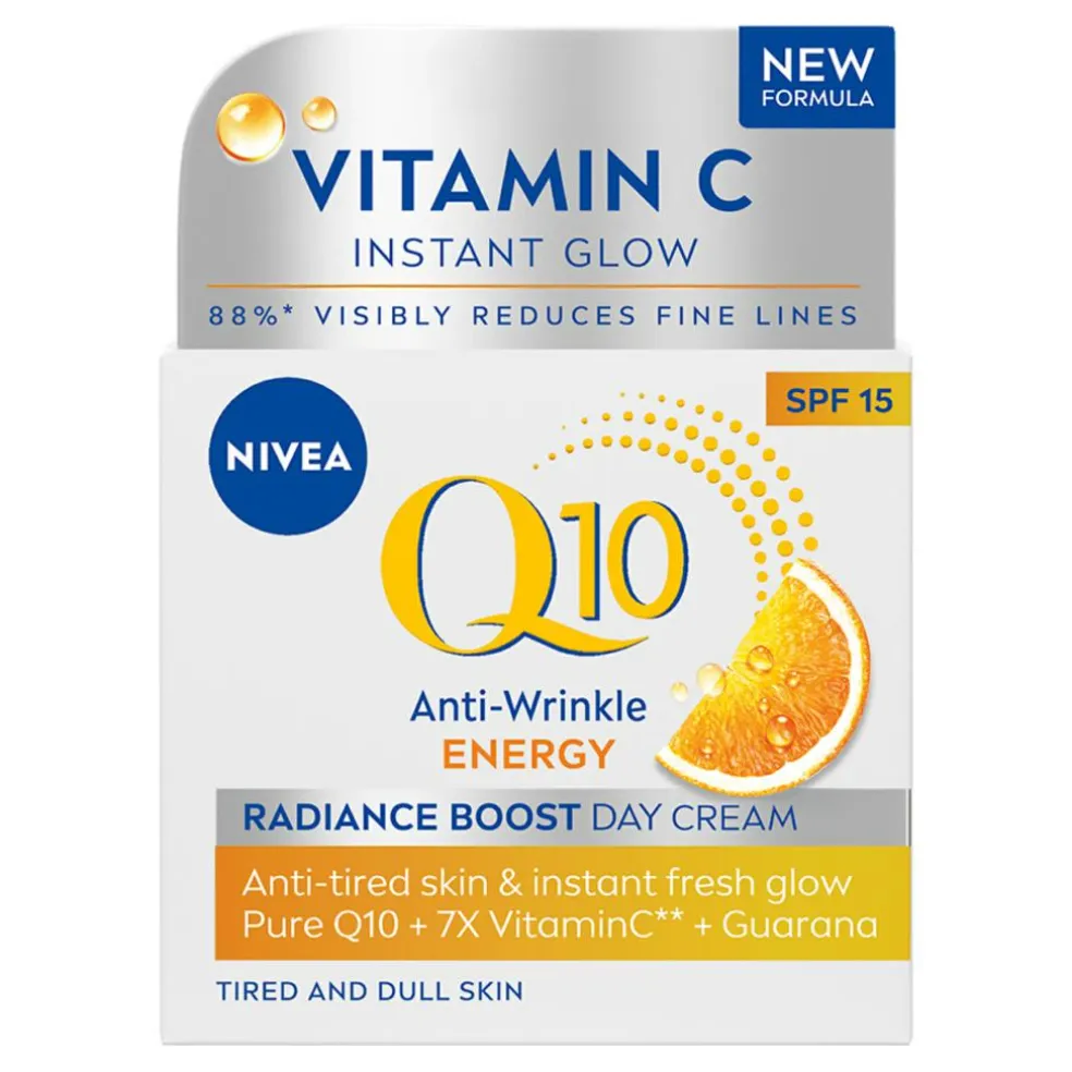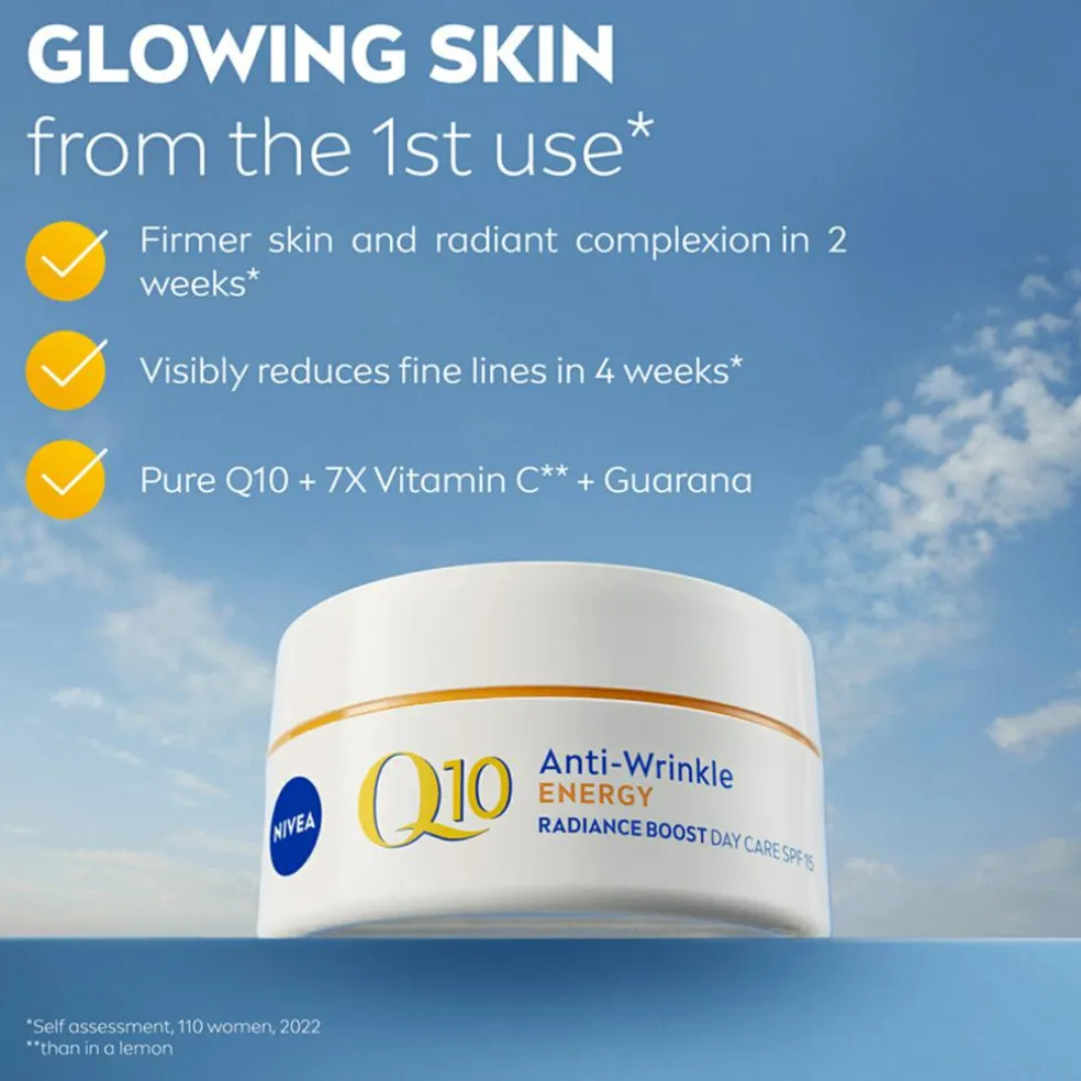 NIVEA Q10 Energy Healthy Glow Day Cream er en dagcreme med en let og forfriskende formel, som hurtigt absorberes af huden og giver en sund glød. Med en mild og frisk citrusduft. Beriget med ren Q10, C-vitamin og guarana-ekstrakt. Q10 øger hudcellernes styrke og hjælper dem med at fungere effektivt samt korrigerer rynker indefra (testet på hudceller). 7X C-vitamin (sammenlignet med en citron): kraftig koncentration for en glat og strålende hud. Guarana-ekstrakt er kendt for at være forfriskende og energigivende. Denne dagcreme indeholder også SPF15, som beskytter huden mod UVA/UVB-stråler, der forårsager for tidlig ældning af huden. 24 timer: opfrisker og giver huden ny energi med det samme for 92 % af kvinder (selvevaluering, 110 kvinder, 2022). Sund glød hele dagen. 2 uger: reducerer synligt træthed i huden for 95 % (selvevaluering, 110 kvinder, 2022). Fastere og mere strålende hud. 4 uger: reducerer synligt fine linjer, hjælper med at modvirke de første tegn på ældning for 91 % (selvevaluering, 110 kvinder, 2022). 88 % af kvinderne bekræfter, at dagcremen synligt reducerer fine linjer (selvevaluering, 2-ugers studie, 110 kvinder, 2022). Denne dagcreme er dermatologisk testet og velegnet til mat og træt hud.