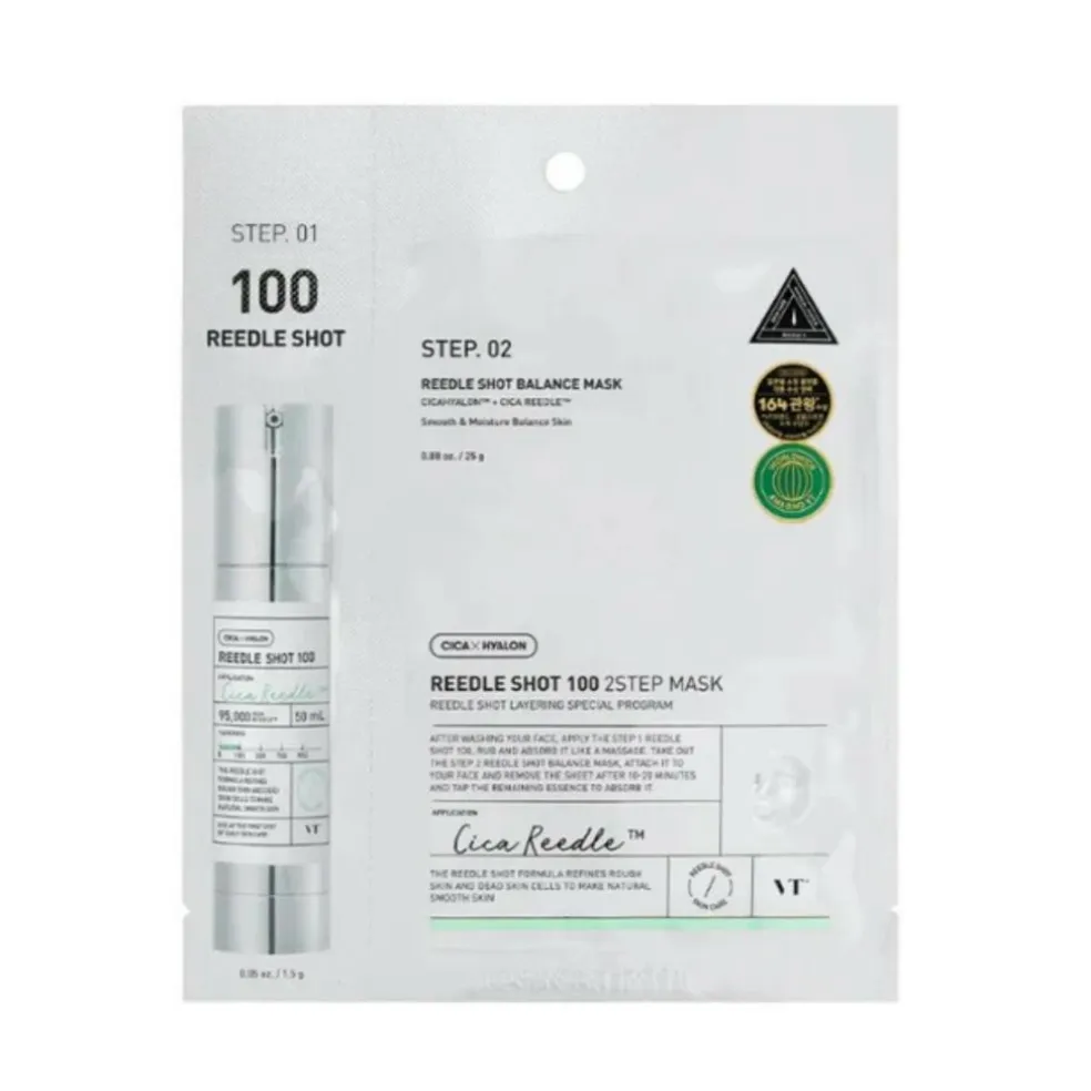 Den todelte pakke indeholder en pose Reedle Shot 100 essens og en sheet mask.