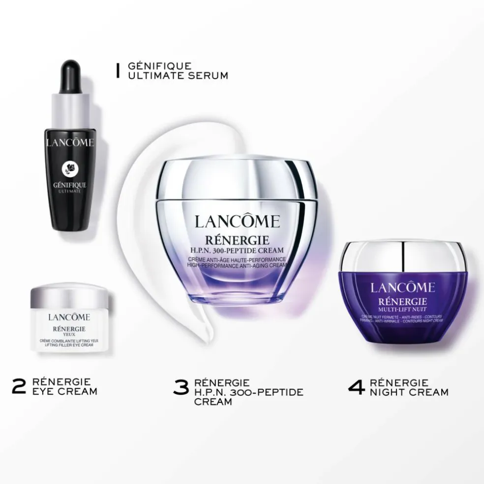 Rénergie H.P.N. 300-Peptide Day Cream er en effektiv anti-aging-dagcreme, som kombinerer 300 typer peptider – den højeste koncentration, Lancôme nogensinde har fremstillet. Advanced Génifique Serum styrker hudbarrieren, Rénergie Eye Cream plejer dit øjenområde og Rénergie Multi-Lift Night Cream fastholder Lancômes opstrammende teknologi, også natten over.