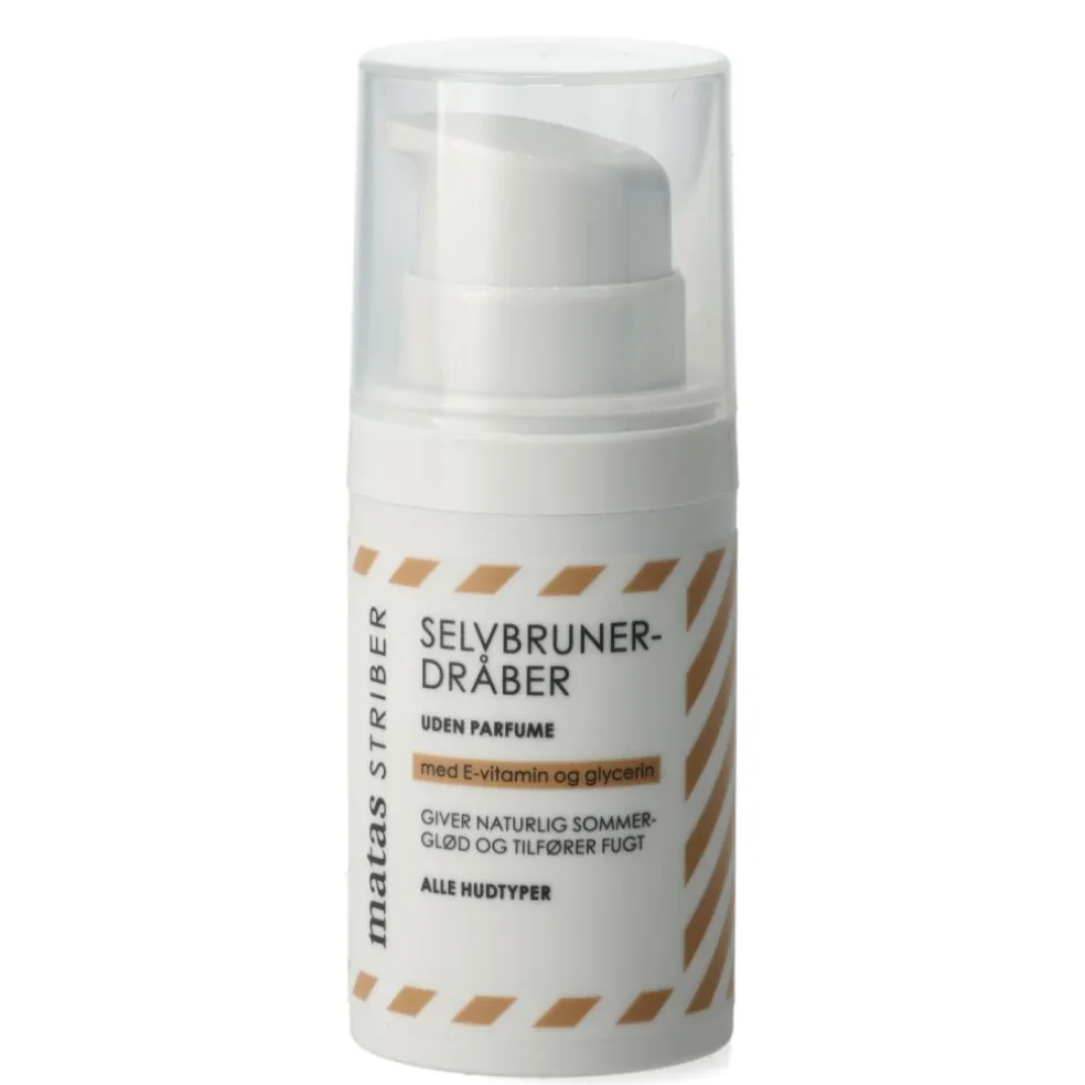 Matas Selvbrunerdråber kan smitte af på tekstiler. Rør derfor ikke ved tøj eller andet stof, før dråberne er trængt helt ind i huden.