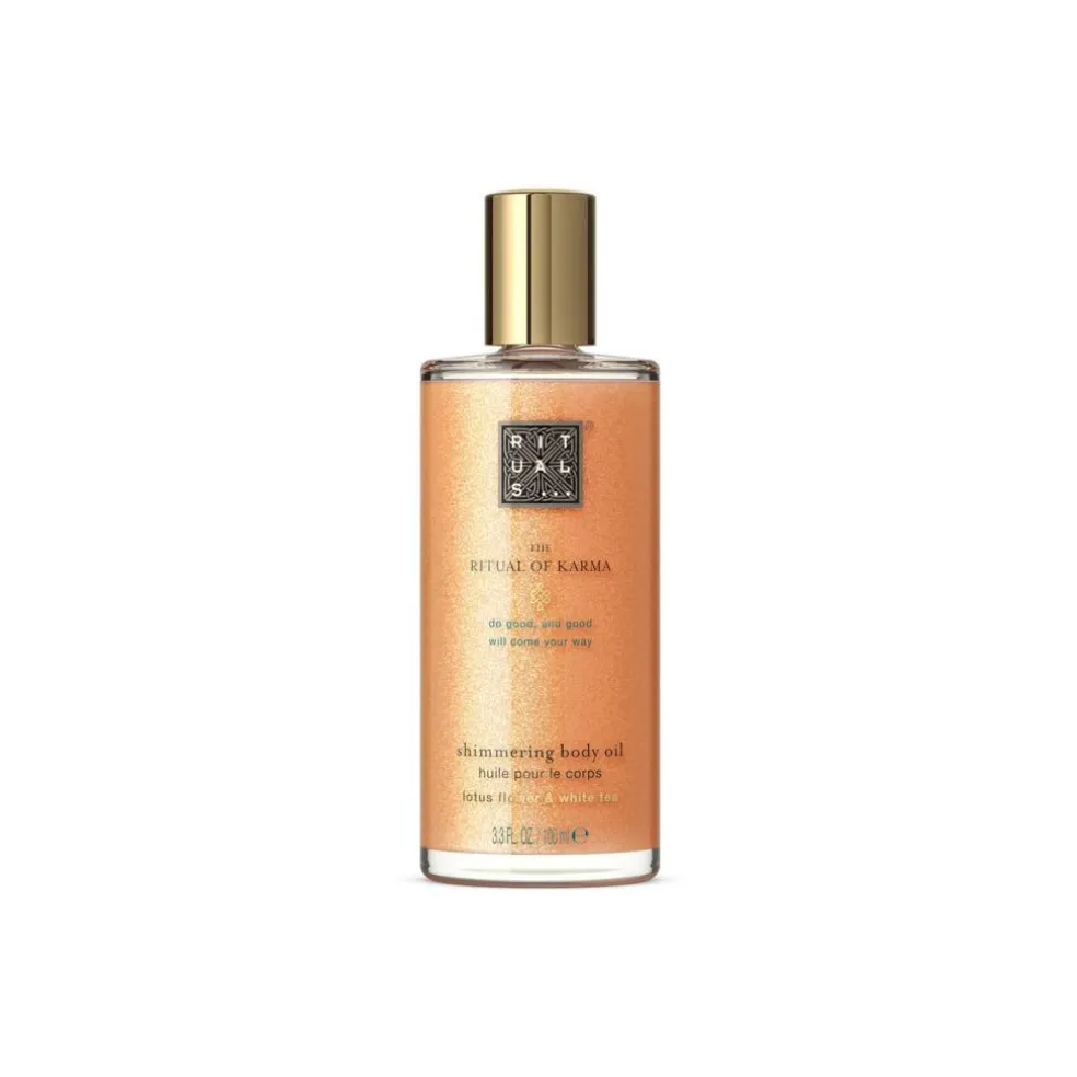 Brug The Ritual of Karma Shimmering Body Oil til at pleje huden med en blanding af jojoba-, oliven- og tidselolie for at få en strålende hud Absorberes hurtigt, plejer og genopliver en kedelig hud, mens en diskret glans af perlemorsfarvede mineralpartikler giver et strålende og lysende look. Den skinnende olie har en delikat, velkendt duft af hvid te og lotusblomst.