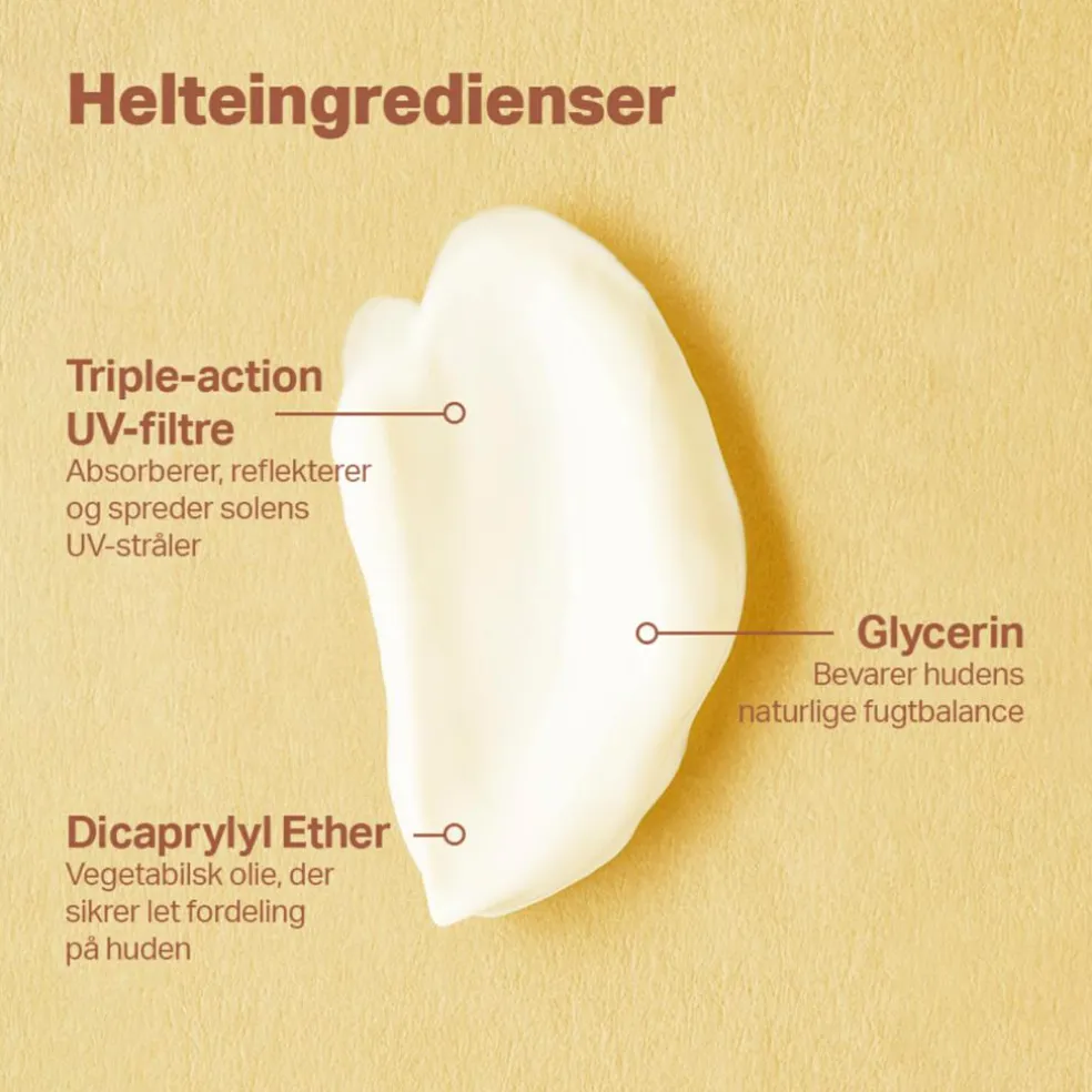 - Påføres i rigelig mængde på kroppen (ca. 40 ml til en voksenkrop) og i ansigtet før soleksponering