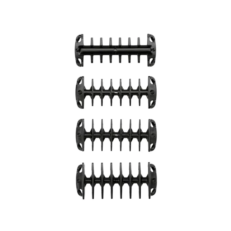 – 3 afstandskamme til skægstubbe og 1 afstandskam til kort skæg (1 mm, 2 mm, 3 mm, 5 mm)