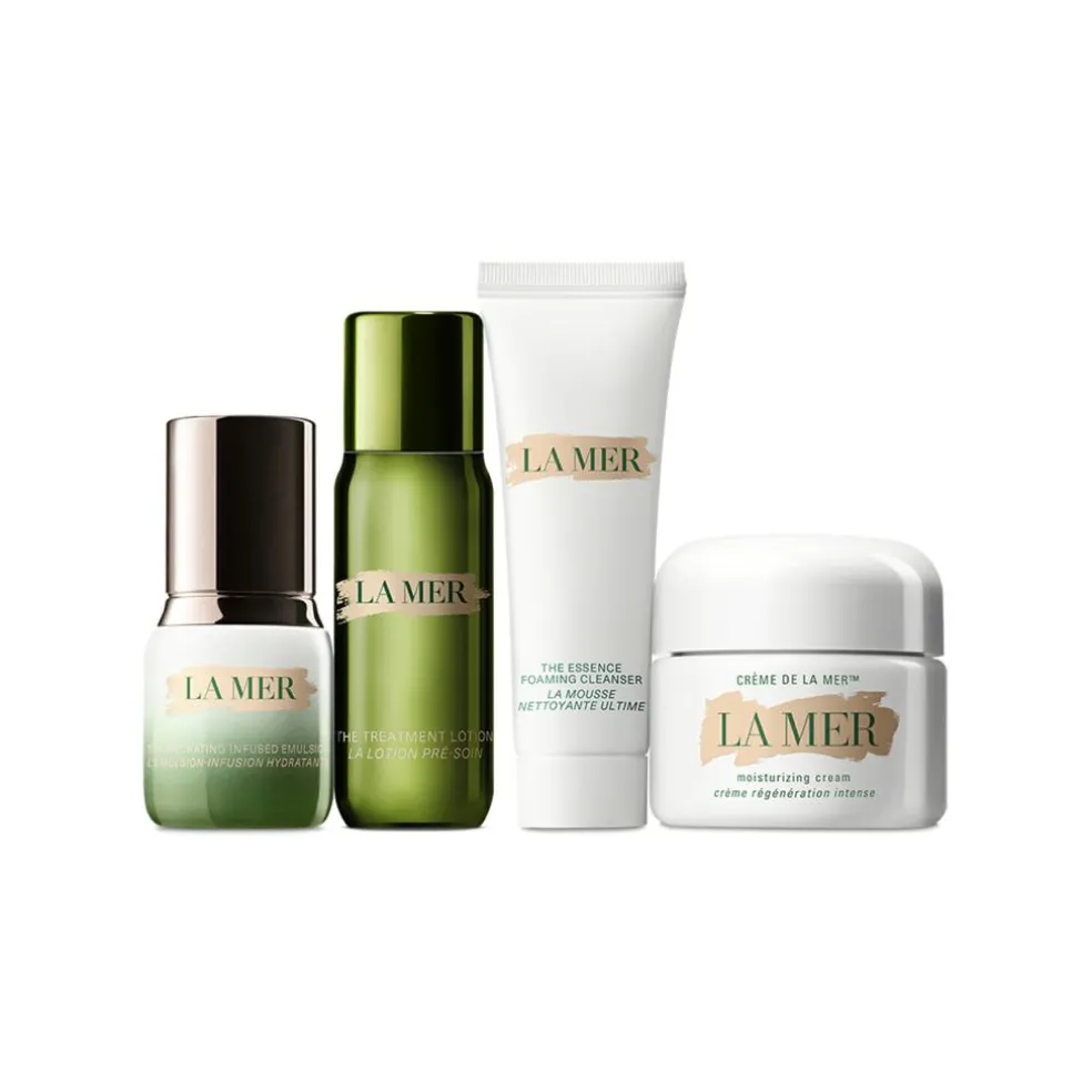 Afslut med Crème de La Mer ved at varme produktet op mellem fingerspidserne, indtil det er gennemsigtigt, og tryk det ind i ansigtet og på halsen efter behov.