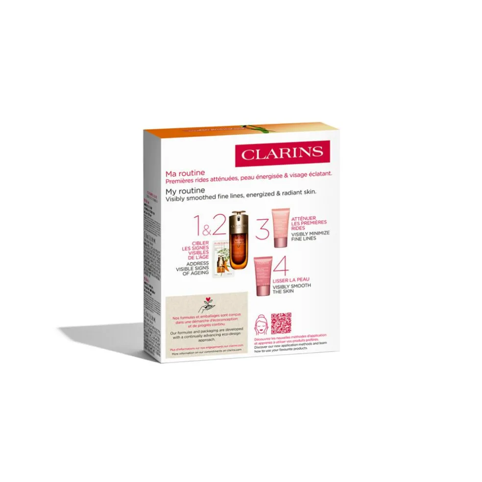 Til ansigtet er der den ikoniske Double Serum, der er formuleret med 27 planteekstrakter, som er målrettet mod tegn på aldring. Den bruges sammen med Multi-Active dag & nat creme med tidsel ekstrakt, som hjælper med synligt at reducere de første tegn på aldring, og denne duo fugter huden, mens den bevarer sit ungdommelige udseende.